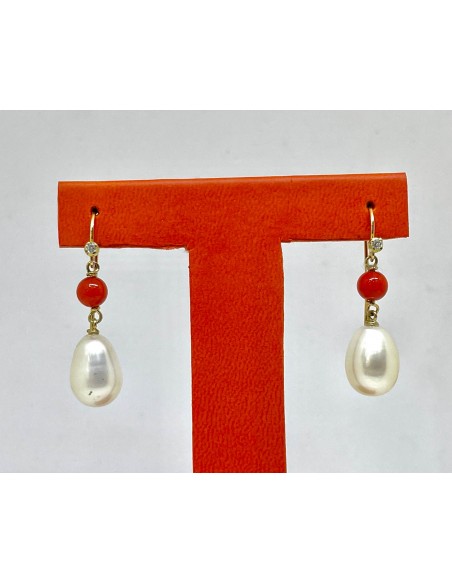 Pendientes de oro de 18 kts. largos, con parte alta con brillante o corazón de oro, a elegir. Parte baja con corales y perlas.
