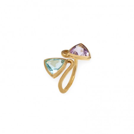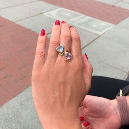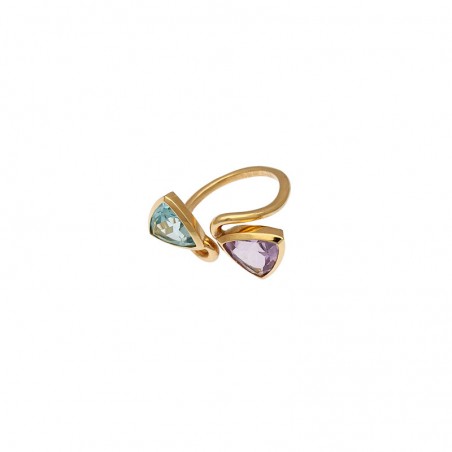 Sortija en oro de 18 kts, con piedras topacio azul y amatista.