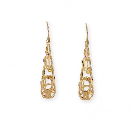 Pendientes de oro de 18 kts. o plata 925 mls. bañada en oro. con forma de gota tejida en una red salpicada de piedras semipreciosas de colores, de la colección "Simetrías Asimétricas".